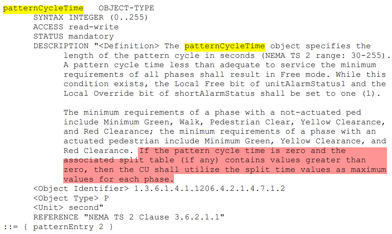 With the exception of Pattern 254 (Free) and Pattern 255 (Flashing), all other patterns within NTCIP 1202v3 are required to specify a cycle length and splits. These parameters are crucial as they define both the intersection's designed capacity and the distribution of that capacity across individual phases.